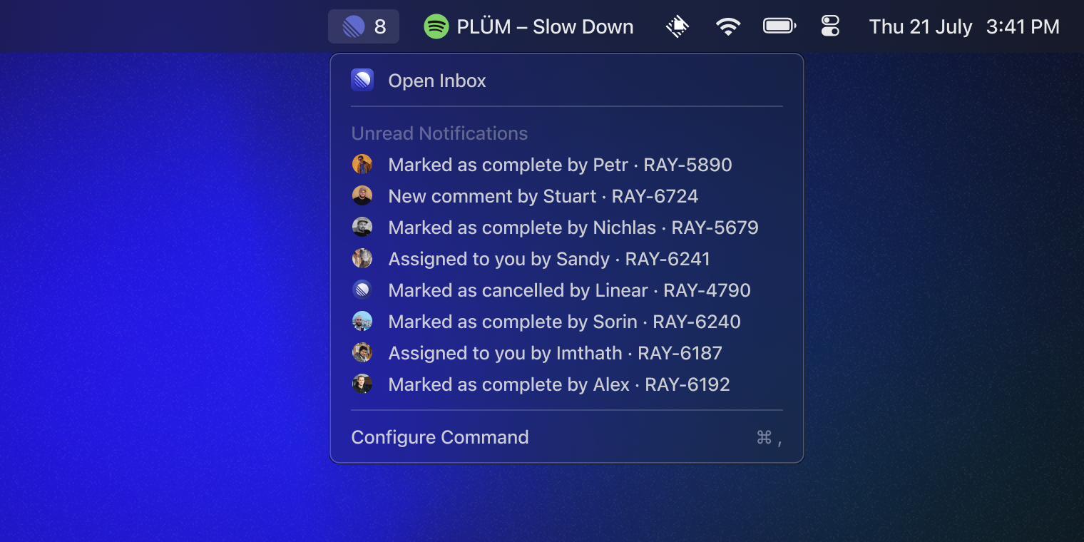 Developers can build extensions with menu bar commands and publish them to the Store so that you can see glance-able information at the top of your screen. We've already seen a great response in developers adopting new ways to make you productive. From Linear notifications to GitHub pull requests and even the latest track playing on Spotify.