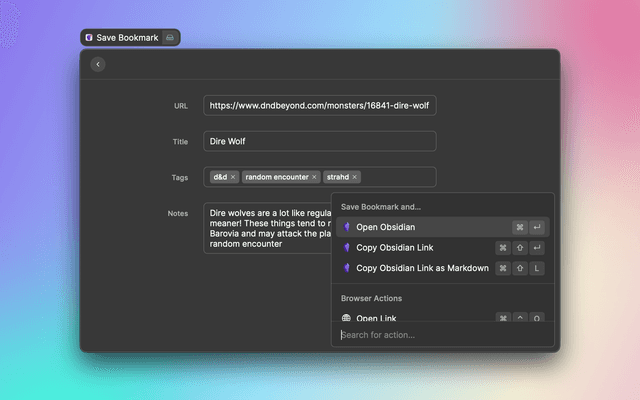 Obsidian Bookmarks lets you use Raycast and Obsidian as a place to manage your bookmarks.