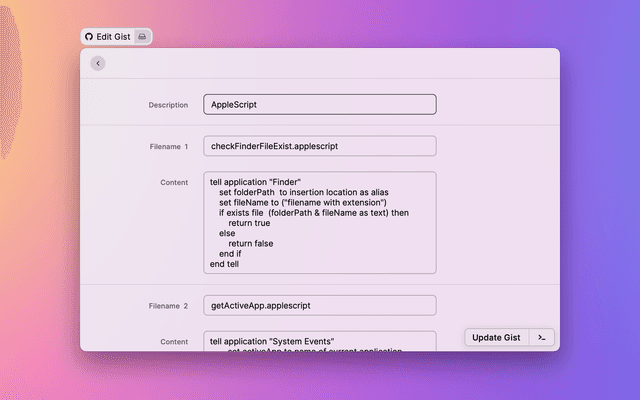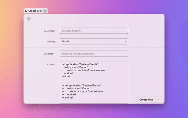 Automatically get the selected text or clipboard and generate a gistfile, you can also add additional gistfiles and finally create a gist. Once created successfully, you can choose to copy the link or open it in your browser.