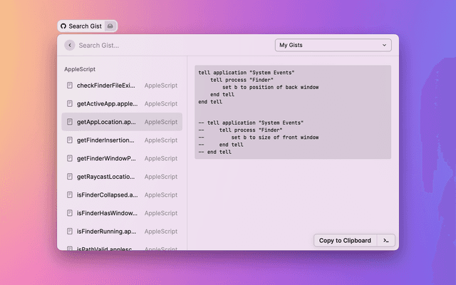 This extension brings GitHub Gist support to Raycast through the personal access tokens. To get started, first: