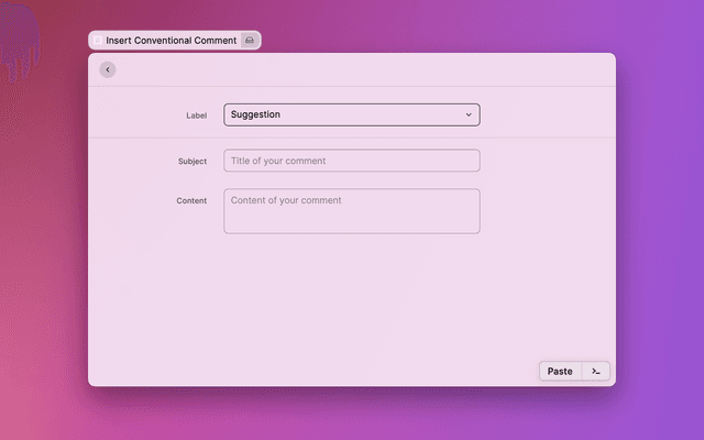 Paste conventional comment into foremost application using Raycast !
