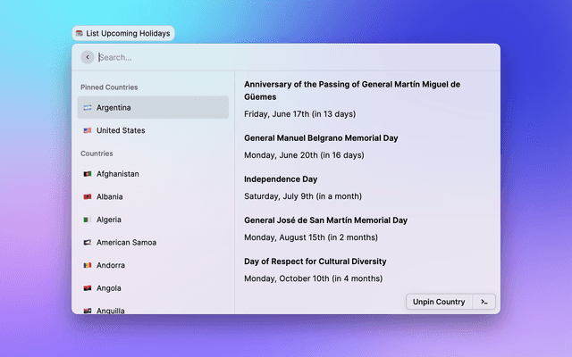 Show the upcoming five holidays for a country